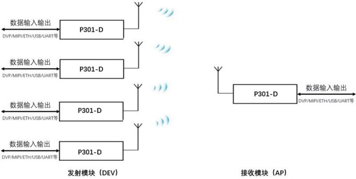 P301-D 是一款 2.4/5.8G 高带宽无线数据传输模块,由无线发射(DEV)模块和无线接收(AP)模块组成。单个无线接收(AP)模块可无线连接1~4个无线发射(DEV)模块;无线接收(AP模块和无线发射(DEV)模块之间可以双向传输高清视频、语音和数据,上下行的带宽比例分配可根据应用场景进行灵活配置。
