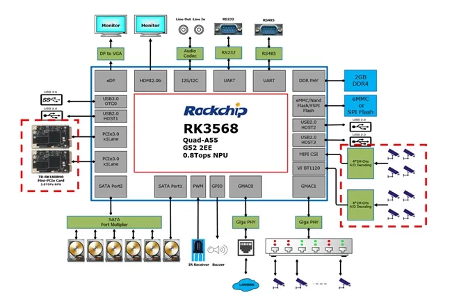 RK3568安防后端NVR/XVR方案,在产品功能上除传统的接入、存储、转发、解码应用,基于其高性能AI算力,还可在人脸对比报警、智能人车检索、越界预警、火警可视化预警等方面展开智能化应用,重构边缘价值。