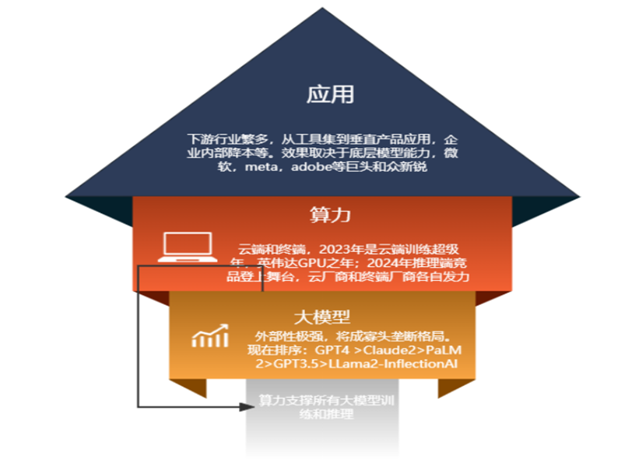 国信证券指出,AI三元素(大模型、算力、应用)呈螺旋式促进关系。AI三元素以“模型更新-算力芯片迭代、单位tokens成本降低-应用增加”循环往复,当三者中有一个要素喷发,就是强刺激期;三者同时没有更新,就会进入停滞期,等待下次爆发。