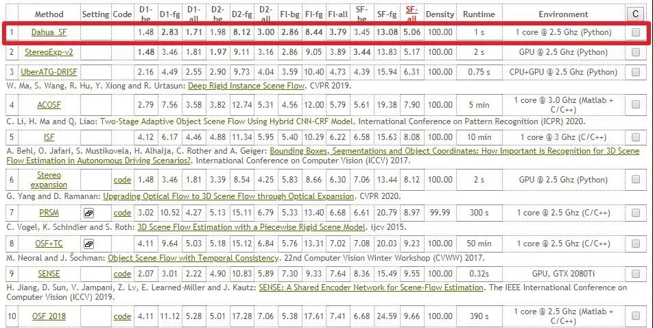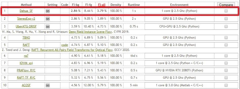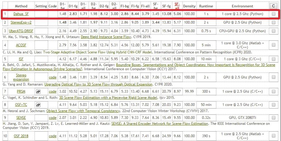大华股份AI取得KITTI Sceneflow排行榜第一