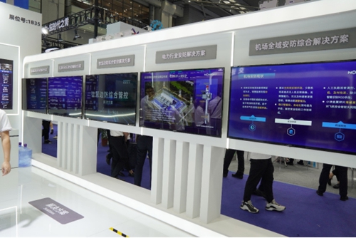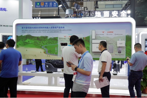 其在地面安全展区展示的地面安全家族采用雷达+视频+震动多维感知融合技术,可实现点、线、面场景全覆盖,全天候、全天时感知,引起了众多观众驻足。
