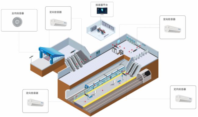 (地铁口的全向拾音器搭配视频监控,24小时全天候守护)
