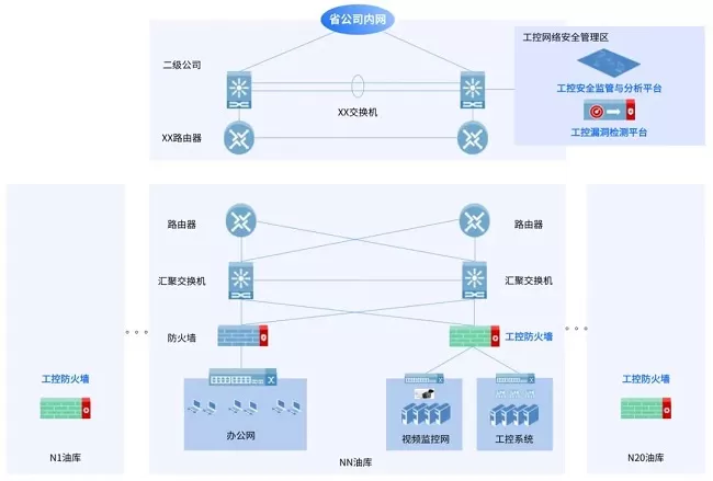 在该公司下属各油库工控系统部署工控防火墙、工控监测审计、工控主机安全卫士等安全设备,实现不同网络区域及部分重要PLC的网络隔离;对系统内网络行为异常、工业协议攻击、工业控制关键事件进行实时监测与预警;对工业主机的主机移动存储介质、工控主机运行加载的程序进行管控,保证工业主机安全。