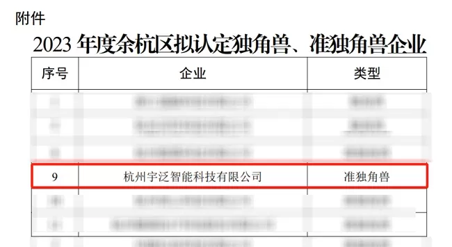 近日,《2023年度余杭区拟认定独角兽、准独角兽企业认定名单》完成公示,宇泛正式认定为2023年度余杭区“准独角兽”企业。