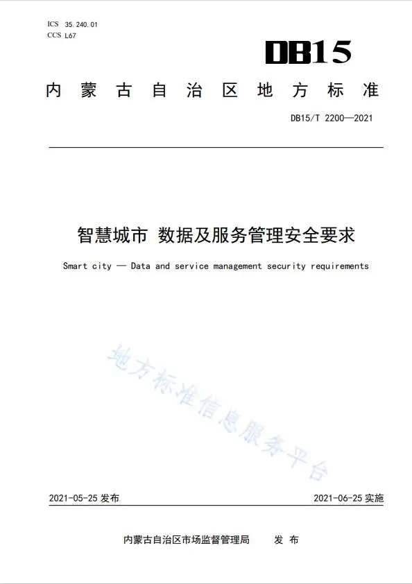 【安防在线 www.anfang.cn】由内蒙古自治区大数据中心宣布提出并归口管理,由内蒙古自治区大数据中心、杭州安恒信息技术股份有限公司、内蒙古工业大学网络空间安全研究所、华信咨询设计研究院有限公司多家单位共同参与起草的《智慧城市 数据及服务管理安全要求》(DB15/T 2200―2021)地方标准,于2021年5月25日发布,并于2021年6月25日正式实施。
