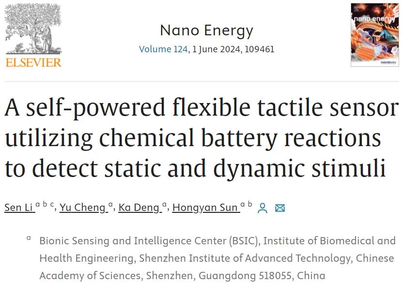 近日,中国科学院深圳先进技术研究院医工所传感中心孙洪岩副研究员团队在中科院一区(IF:17.6)期刊《Nano Energy》上发表了题为A self-powered flexible tactile sensor utilizing chemical battery reactions to detect static and dynamic stimuli的研究(全文链接:https://doi.org/10.1016/j.nanoen.2024.109461)。该团队提出了一种基于化学电池反应的自供电柔性触觉传感器,用于动态和静态机械刺激检测。本文李森博士为第一作者,孙洪岩副研究员为唯一通讯作者,中国科学院深圳先进技术研究院为第一单位。