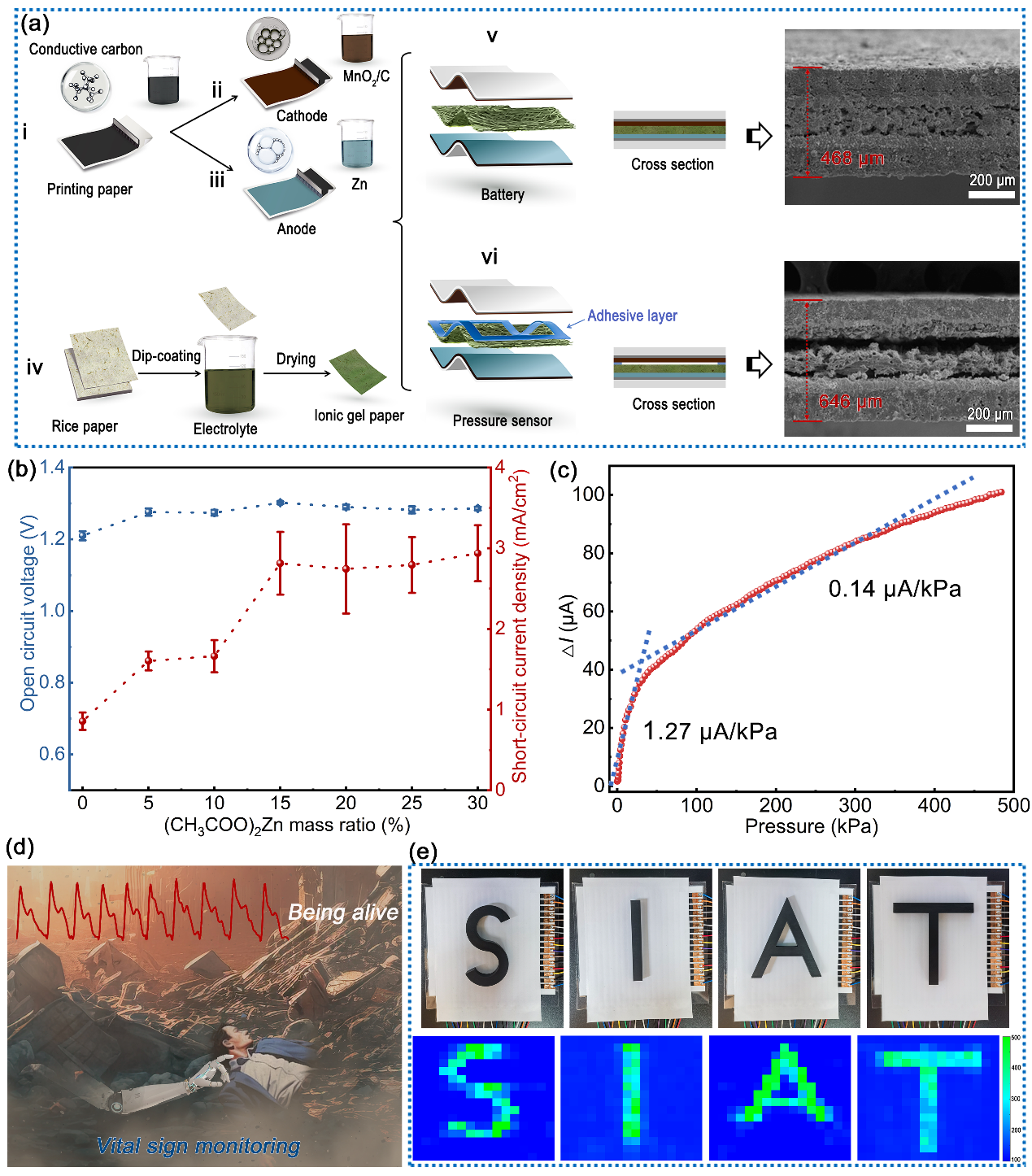 为了解决上述问题,本团队通过简单的结构设计,将纸质基底的固态Zn-MnO2电池转变为自供电压力传感器。作为电池,其展现出了1.29 V的开路电压、2.8 mA/cm²的最高短路电流密度,足以为小型电子器件供电。作为自供电压力传感器,其具有较高的灵敏度,在0-25 kPa范围内平均为1.27 μA/kPa,在25-500 kPa范围内平均为0.14 μA/kPa,响应时间为42 ms,恢复时间为41 ms,最小压力分辨率达到数十帕斯卡,且具有长期重复性和稳定性。该工作将极大地促进智能,自供电触觉传感器的进一步发展,广泛应用于人类健康护理和检测静态/动态刺激的人机界面等领域。