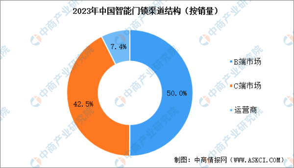 从智能门锁销售渠道来看,B端市场仍占市场主力,但同比有所下降,占比约50%,C端市场销量占比42.5%,运营商市场销量占比7.4%,渠道呈多样化发展。