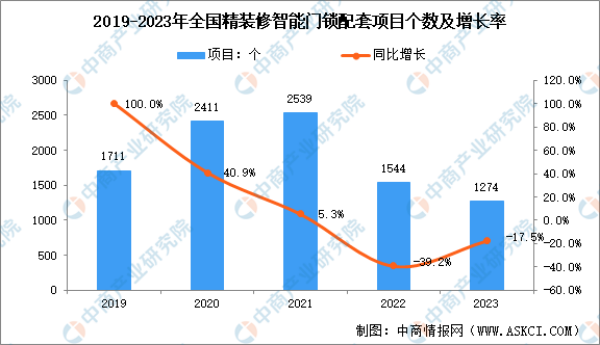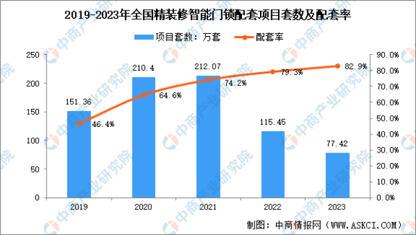根据奥维云网(AVC)监测数据,2023年全国精装修市场智智能门锁配套项目数为1274个,同比下降17.5%;配套规模为77.42万套,同比下降32.9%。智能门锁已趋于成为精装修市场的标配,2023年的配置率高达82.9%,在智能家居产品中普及度最高。