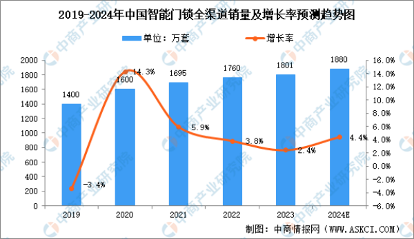 我国智能门锁行业发展起步于20世纪90年代,随着技术进步,智能门锁种类增多,带动我国智能门锁行业市场销售量增长。近三年,受经济环境的影响,智能门锁市场规模增速有所放缓。中商产业研究院发布的《2023-2028年中国智能家居产业前景预测与战略投资机会洞察报告》显示,2023年智能门锁市场的全渠道销量为1801万套,同比增长2.4%。预计未来新型电商渠道如小红书、抖音、B站等平台将推动智能门锁销量上升,2024年全渠道销量将进一步增长至1880万台。