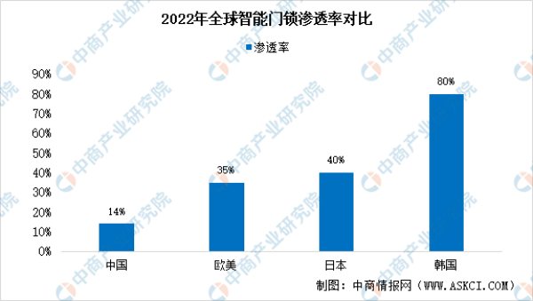 目前,我国智能门锁渗透率约为14%,欧美、日本、韩国渗透率分别为35%、40%、80%。相较全球其他地区,我国整体智能门锁渗透率仍较低。