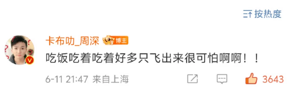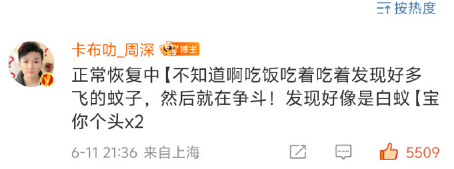 近期,南方地区迎来梅雨季节,湿润的气候不仅带来了连绵的阴雨,也催生了白蚁的大量繁殖和飞行。歌手周深近日发文称:吃饭吃着吃着发现好多飞的蚊子,然后就在争斗!发现好像是白蚁……