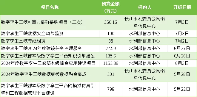 从招标信息来看,涉及项目包括AI算力集群采购、数据安全风险监测、专线租赁、监理服务、数字孪生平台知识引擎建设等多个方面,预算金额累计超过数千万元。这些项目的实施,将为数字孪生三峡的全面建设提供有力支撑。接下来可能还会继续有新的项目发布,值得关注!