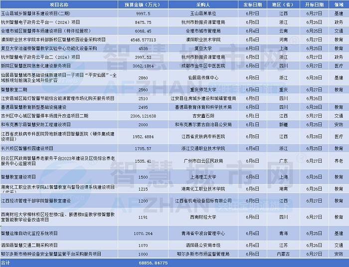 1)玉山县城乡智慧体系建设项目(二期)(预算9997.5万元);其次为杭州智慧电子政务云平台一(2024)项目(预算8475.75万元);第三为会理市城区智慧停车场建设项目(特许经营权)(预算6068.45万元)。值得关注的是杭州市数据资源管理局盖发布了杭州智慧电子政务云平台二(2024)项目(预算3997.53万元),两个项目总金额超过了1个亿。西南财经大学柳林校区经世楼C座、颐德楼H座教学楼智慧教室智能教学设备改造项目(预算1191万元)首次发标时间为5月15日,6月4日更正信息至6月27日开标。