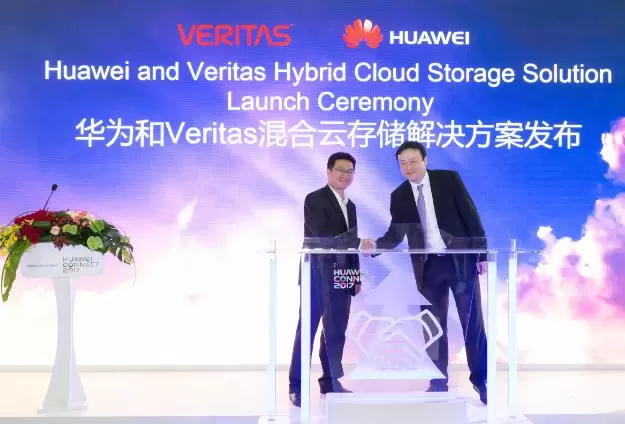 华为代表(左)和Veritas代表(右)出席混合云存储解决方案发布仪式
