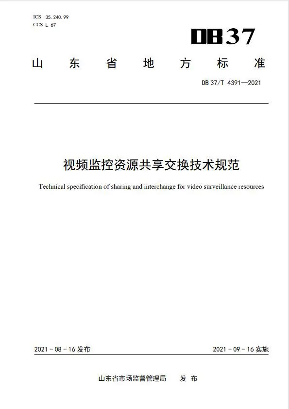 【安防在线 www.anfang.cn】由山东省大数据局提出、归口并组织实施,由山东省大数据中心、中共山东省委政法委员会、山东省大数据局、山东省公安厅、山东省标准化研究院、山东新一代标准化研究院有限公司、山东广电网络有限公司、杭州海康威视数字技术股份有限公司、华为技术有限公司、浙江大华技术股份有限公司等多家单位共同参与起草的《视频监控资源共享交换技术规范》(DB37/T 4391―2021)地方标准,于2021年8月16日发布,并于2021年9月16日正式实施。