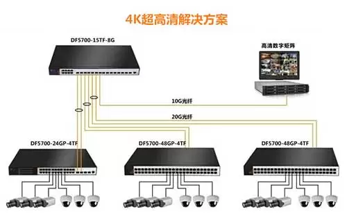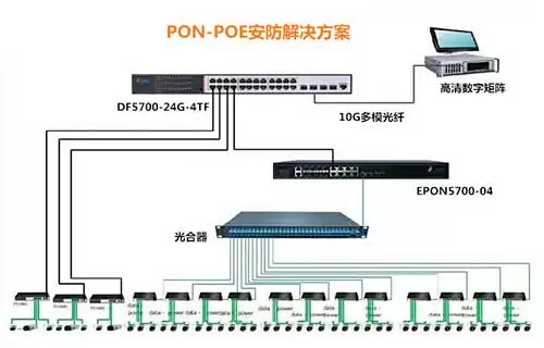 另外应对安防光网传输需求,丰润达还推出了业界首款PON-PoE 交换机,及相应的解决方案。此方案运用DF5700系列、PoE交换机及PON-PoE 交换机等产品,采用光纤传输,突破传统线缆传输瓶颈,让数据大范围、远距离覆盖,并且施工及维护更加简单。在未来城市安防建设中,将发挥不可估量的作用。