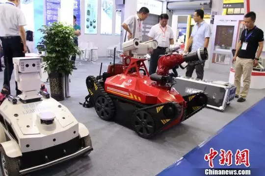 第六届中国-亚欧安防博览会上展示的一台智能消防灭火机器人。孙亭文摄