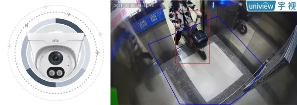 宇视AI摄像机内置深度学习算法,可以智能识别电动车,一旦检测到电动自行车进入电梯等封闭空间,摄像机会发出声光报警,通过灯光闪烁和警示语音播报劝离车主。系统同时可以向APP推送报警消息,必要情况下,物业管理人员可以通过APP进行远程喊话。搭配系统平台产品使用时,还可将报警事件上报,进而触发蜂鸣器报警、监控画面弹屏等提示,物业人员可以快速反应,采取必要措施。