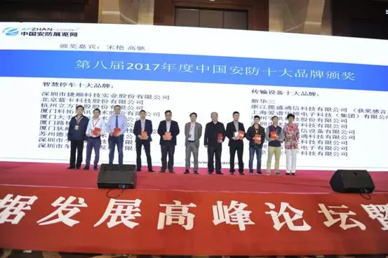 在一片热烈的掌声中,盛典进入高潮部分,十大品牌颁奖、第二届中国安防百强工程商和中国安防地区优质工程商奖纷纷摆上流程。十大品牌颁奖作为本次盛典的重头戏之一,备受关注。蓝卡科技凭借2017年在安防停车场市场的优异表现及AI云无人值守停车场的潮流引领,经过层层筛选,最终从众多提名企业中脱颖而出,收获【智能停车类-第八届2017年度中国安防十大品牌】、【第一届2017中国年度安防创新品牌】荣誉,实至名归。
