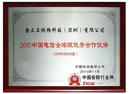 【安防在线 www.anfang.cn】 11月5日,由中国电信集团公司主办的“2010全球眼高层论坛暨(首届)合作伙伴大会”在北京胜利召开,大会颁发了“2010中国电信全球眼优秀合作伙伴”大奖。作为中国电信全球眼的重要合作伙伴金三立表现出色,经过严格评选,荣获“DVR/DVS优秀合作伙伴”大奖。