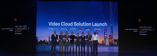 华为政府解决方案部总经理白建华(左五)及合作伙伴发布视频云解决方案