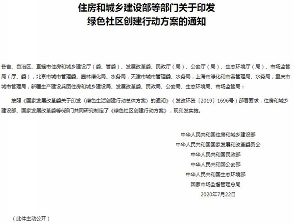 7月29日,从住建部网站获悉,住建部、公安部等6部门联合印发《绿色社区创建行动方案》的通知,提出到2022年,绿色社区创建行动取得显著成效,力争全国60%以上的城市社区参与创建行动并达到创建要求,基本实现社区人居环境整洁、舒适、安全、美丽的目标。