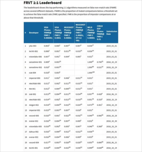 就在本月,依图科技连续第四次获得了美国国家标准技术局举办的人脸识别算法测试的冠军。在新的测试结果中,依图科技以千万分之一误报下的识别准确率超过99%的成绩获得第一,是目前全球唯一一家做到千万分位超过99%,百万分位超过99.7%,万分位接近100%的厂商。除计算机视觉之外,依图在语音识别、语义理解、智能决策、AI芯片等领域都达到领先水平。