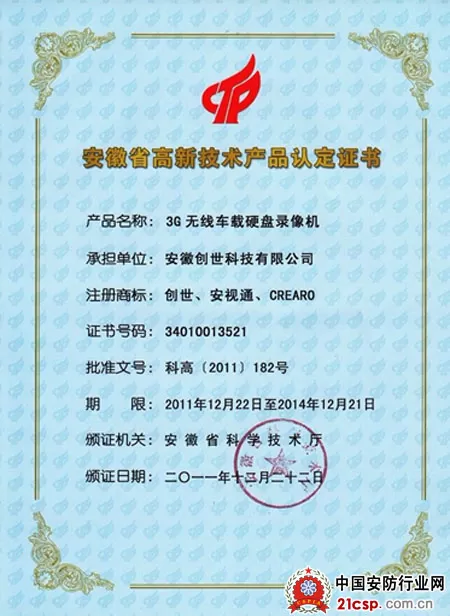 龙年伊始,创世喜事连连。近日,由省科技厅举办的”2011年度安徽省高新技术产品” 项目评审结果隆重揭晓,安徽创世科技有限公司自主研发的3G无线车载硬盘录像机CR6004M,经省高新技术产品认定专家评审会一致通过,省科技厅审批认定为高新技术产品,并颁发《安徽省高新技术产品认定证书》。