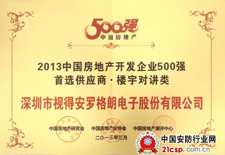 2013年3月22日,500多位来自于房地产产业链品牌企业的代表齐聚北京国贸三期,共同见证开发企业500强测评及首选供应商品牌结果的诞生。与会同时,《2013中国房地产开发企业500强首选供应商品牌测评报告》一并发布,报告汇聚了19个不同的行业10强品牌。其中,在可视对讲类的评测中,视得安罗格朗以21%的采用率名列行业榜首,继2012年后再次成为500强企业楼宇对讲首选品牌第一名。