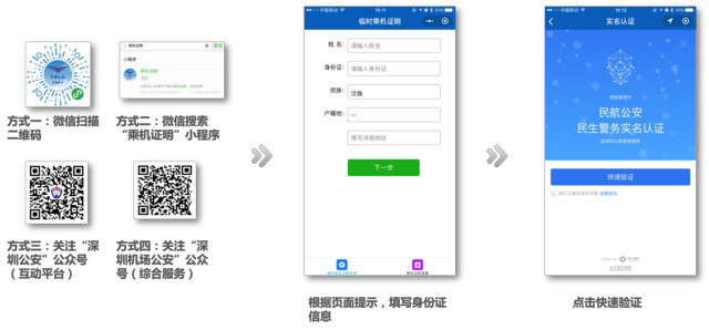 乘客申请电子临时乘机证明,可以有四个入口进行申请:①微信小程序(乘机证明);②现场扫二维码;③深圳公安微信公众号;④深圳机场公安微信公众号。