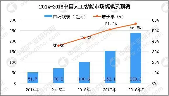 2018年上半年,我国人工智能政策不断落地,技术应用商业化进程加快。十八大以来我国的信息化水平大幅提升,互联网用户数量跃居世界第一,信息领域核心技术步深刻改变了人们生活的诸多方面,而人工智能技术和应用飞速发展,带来更为持久深刻的思维与变革。政策层面,国务院发布的《新一代人工智能发展规划》提出“到2030年,使中国成为世界主要人工智能创新中心”。在我国国家战略规划中,人工智能已超越技术概念,上升为国内产业转升级、国际竞争力提升的发展立足点和新机遇;行业应用层面,巨大的行业应用需求场景、研发能力积累与海量的数据资源、开放的市场宏观环境有机结合,形成了我国人工智能发展的独特优势,依靠应用市场广阔前景,推动技术革新,形成技术和市场共同驱动。预计2018年中国人工智能市场规模将达到238.2亿元。