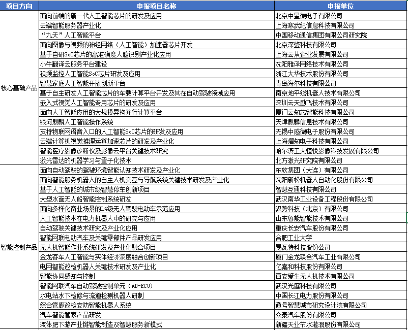 根据此次发布的公示名单来看,共包含9大项目方向,具体为核心基础产品、智能控制产品、智能理解产品、制作业智能化提升、产业智能升级、民生服务智能化、训练资源服务平台、标准测试评估体系以及安全保障体系。