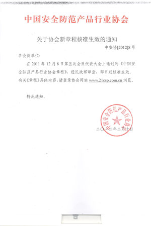 在2011年12月8日第五次会员代表大会上通过的《中国安全防范产品行业协会章程》,经民政部审查,即日起核准生效。有关《章程》具体内容,请登录协会网站www.21csp.com.cn浏览。