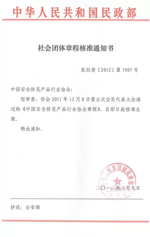 经审查,你会2011年12月8日第五次会员代表大会通过的《中国安全防范产品行业协会章程》,自即日起核准生效。