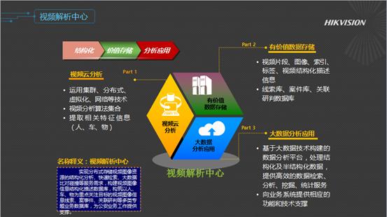 海康威视方案:视频解析中心。实现分布式存储视频图像资源的结构化分析、快速检索、大数据比对碰撞等服务需求,构建视频图像信息结构化描述数据库,构筑以人、车、物为重点关注目标的视频图像信息线索、案事件、关联研判等多类专题业务数据库,为公安业务工作提供支撑。