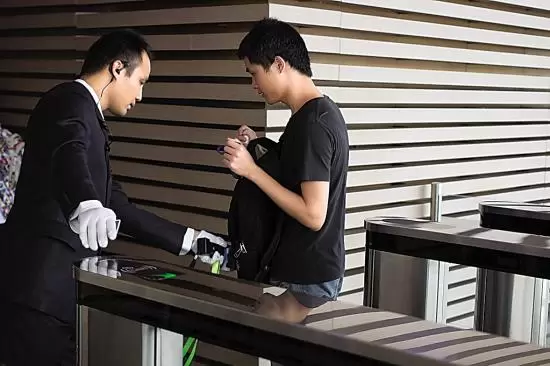早上9时20分正是写字楼人员进出的高峰期,在富力中心正门处执勤的陈先生顾不上搭理记者,专注地盯着进出白领。看到背着大包或者拖着行李的陌生面孔,陈先生马上上前将对方请到一旁,用金属探测器上下“扫”一遍。正门的一旁,想要上楼办理签证的白领在前台排起长龙进行访客登记。像这样的检查是全天候进行,访客从正门进,从另外两个门出,都有可能被检查。